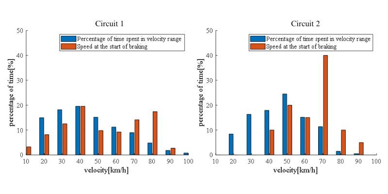 Clearly, the conditions at which the braking maneuvers take place are very different for each circuit and vary from driver to driver. Nevertheless, the analysis showed that the most common speed range at which the drivers started to brake for circuit 2 was between 50 and 70 km/h.